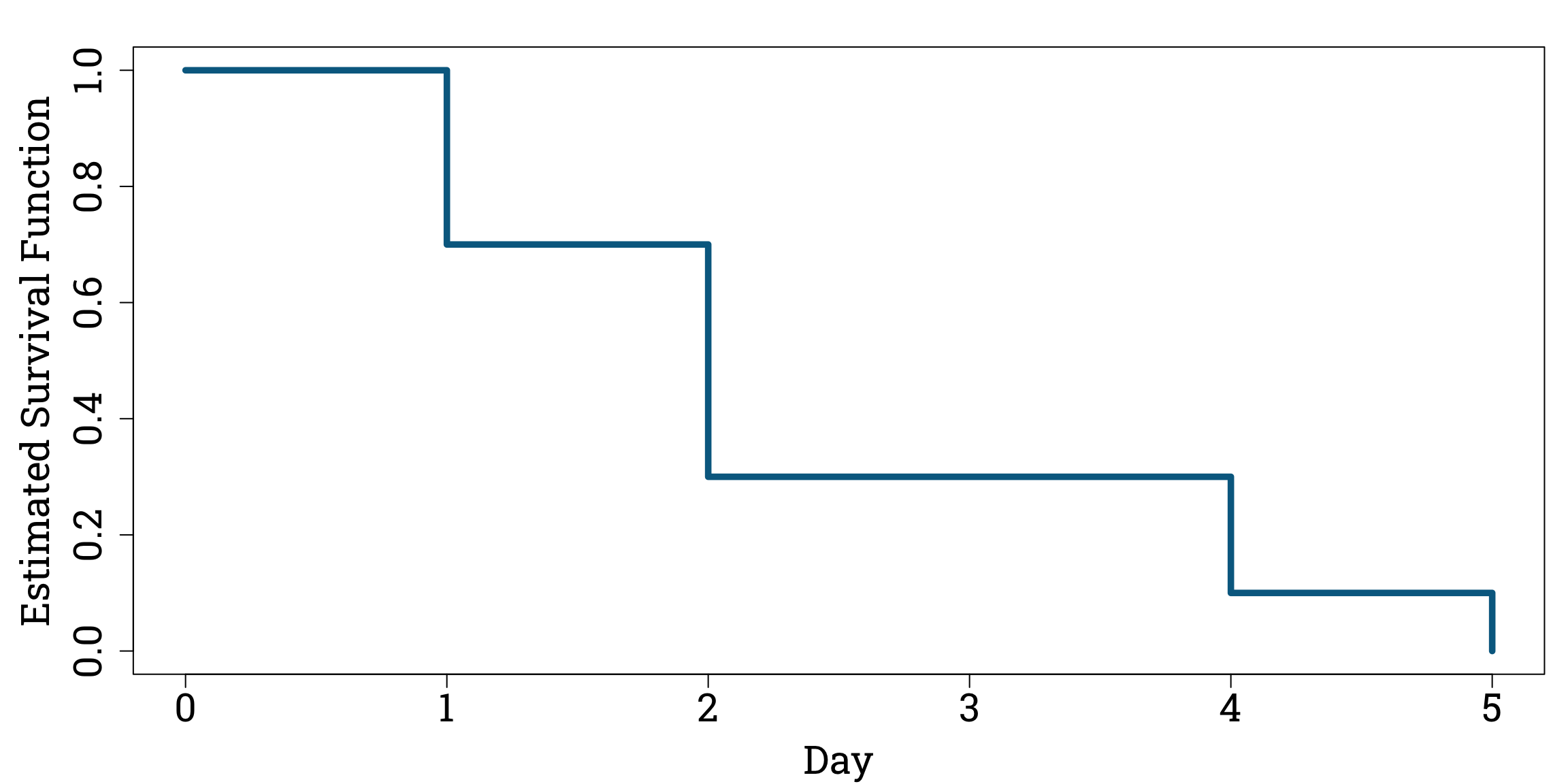 Putting aside the fact that this is a very small sample, it is relatively straightforward to estimate the survival function for these faulty light bulbs from this experiment. For example, to estimate \(S(1)\), we just look at the proportion of light bulbs that last longer than one day – seven tenths. By the law of large numbers, as we increase the number of light bulbs in the sample this proportion will eventually converge to the true probability of a faulty light bulb lasting longer than one day. We can do this calculation for each time marker, including the start point of the experiment – we call this Day 0.
