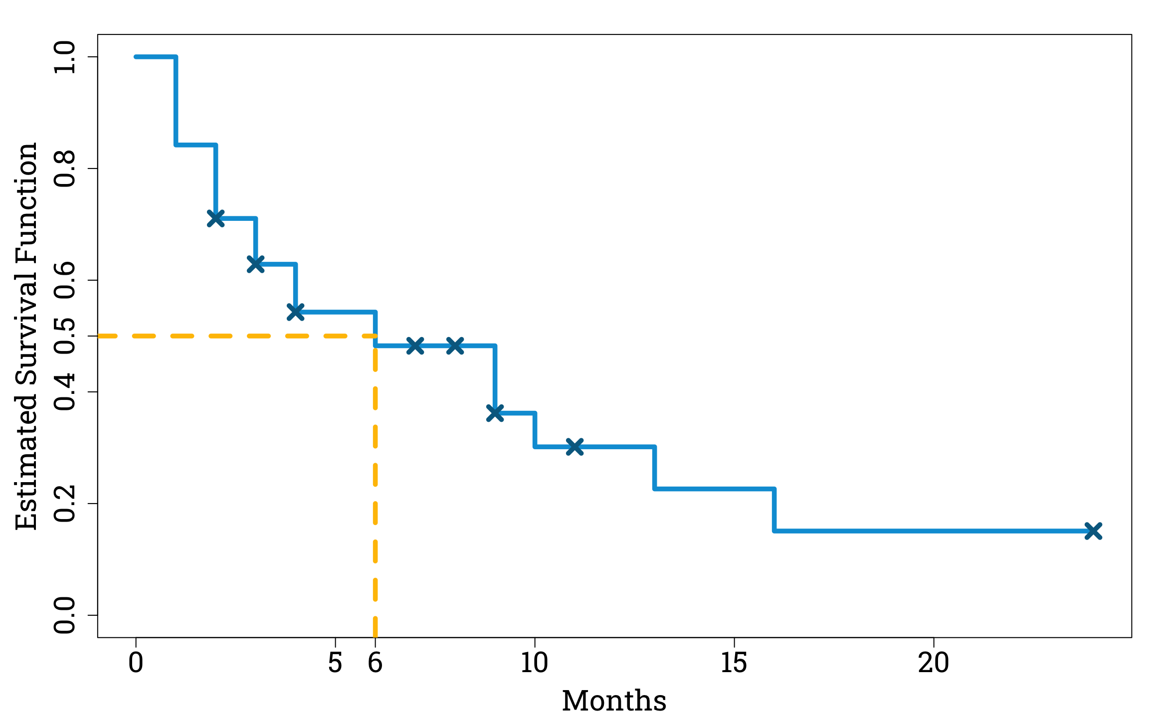 segments(-1, 0.5, median_month, 0.5, col="#ffc000", lwd=4.8, lty=2) # plotting the line across from the y-axis to the survival curve