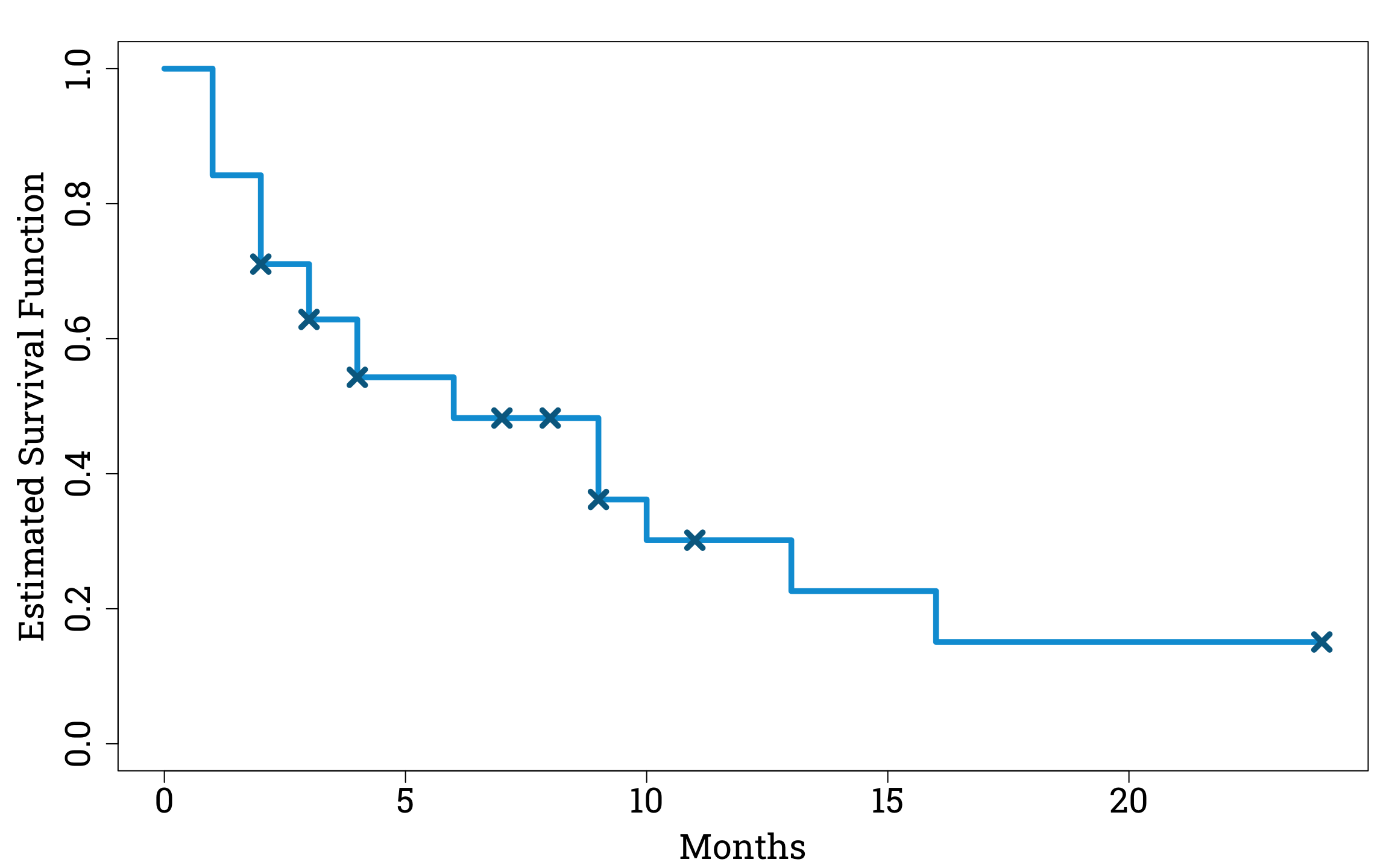 We can now plot our estimate for \(\mathbb{P}(T>t)\) as a stepwise function of \(t\). As is conventional when plotting Kaplan-Meier curves we also mark the months in which censoring occurs.