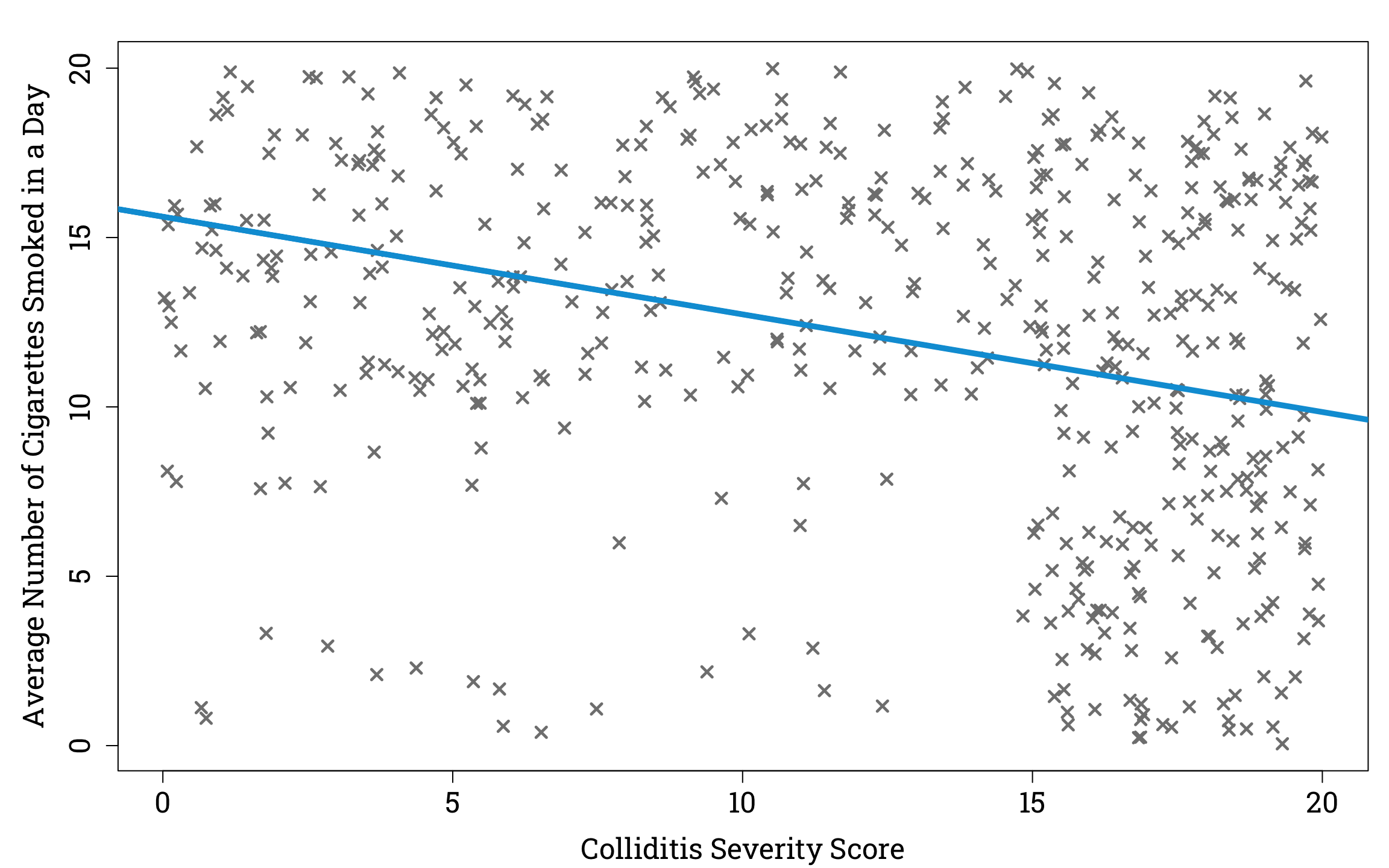 xlab="Colliditis Severity Score", ylab="Average Number of Cigarettes Smoked in a Day",