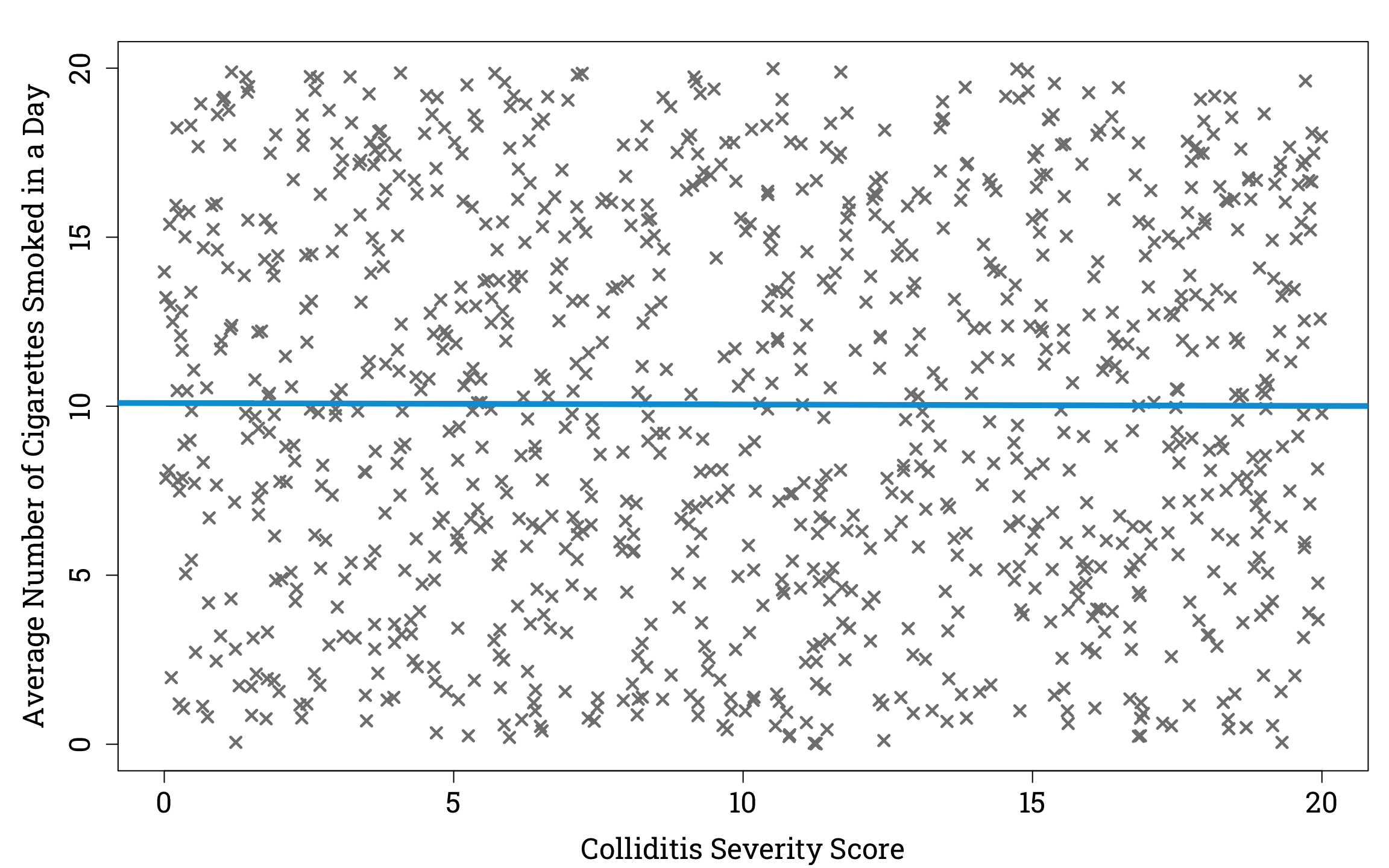 Plotting the Relationship Between Disease Severity and Average Number of Cigarettes Smoked in a Day in a Simulated Sample of People Infected With Colliditis in R