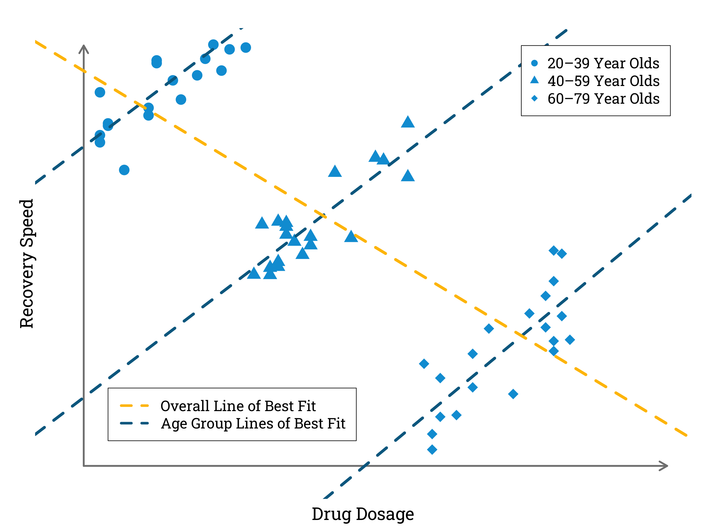 In the simulated data plotted above, a higher dosage of the treatment drug corresponds with a faster recovery speed within each age category. However, when we combine data from all the age categories we find a negative correlation between drug dosage and recovery speed.
