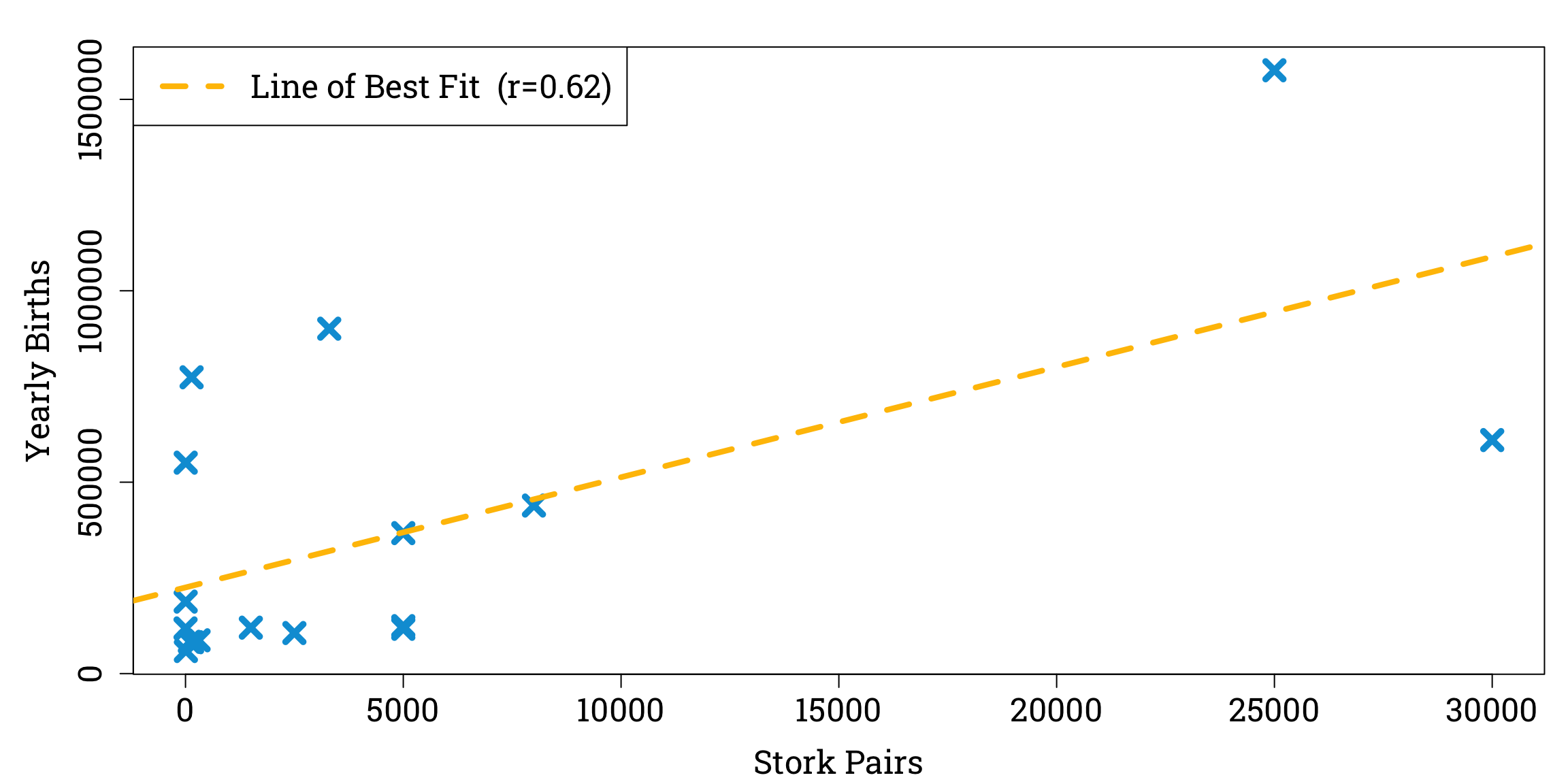 xlab="Stork Pairs", ylab="Yearly Births",